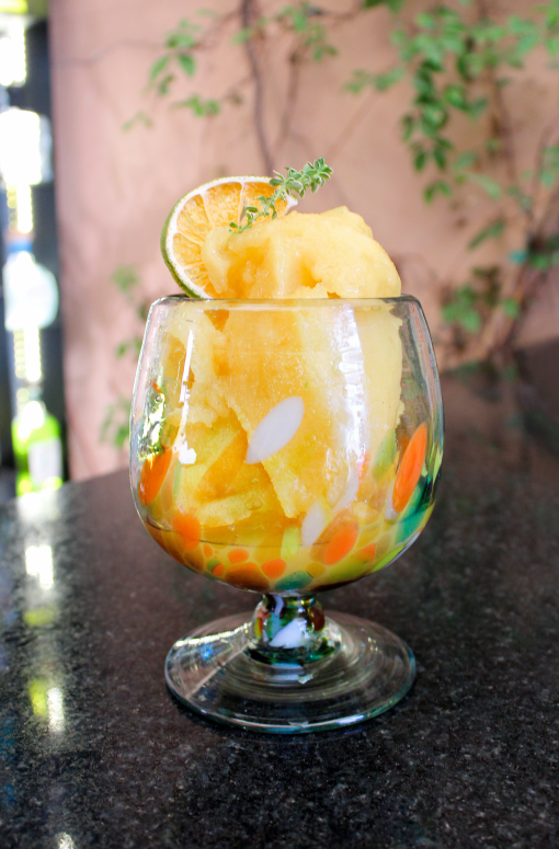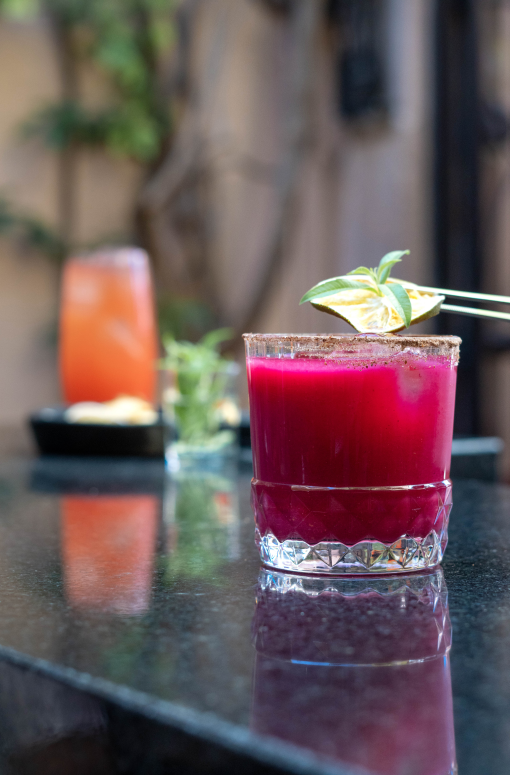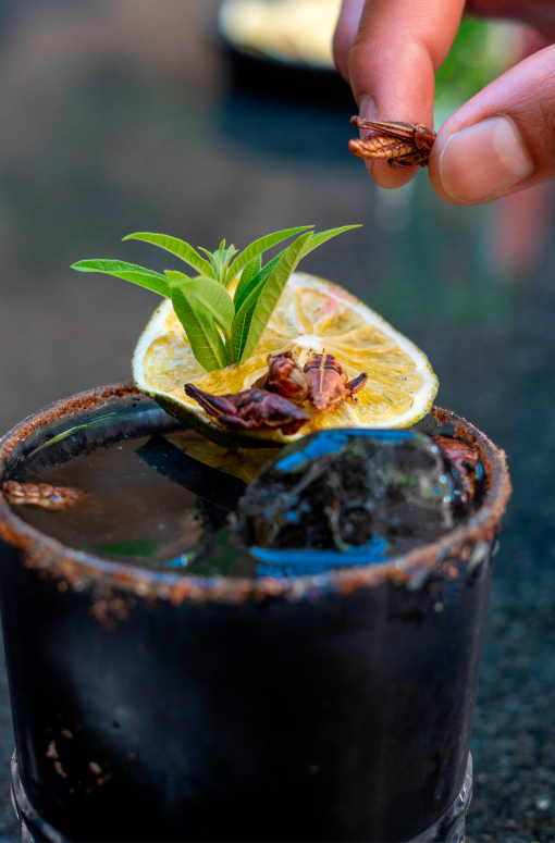 Red prickly, mezcal, grasshopper syrup, eureka lemon and Grand Manier frosted with grasshopper salt.
