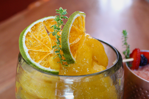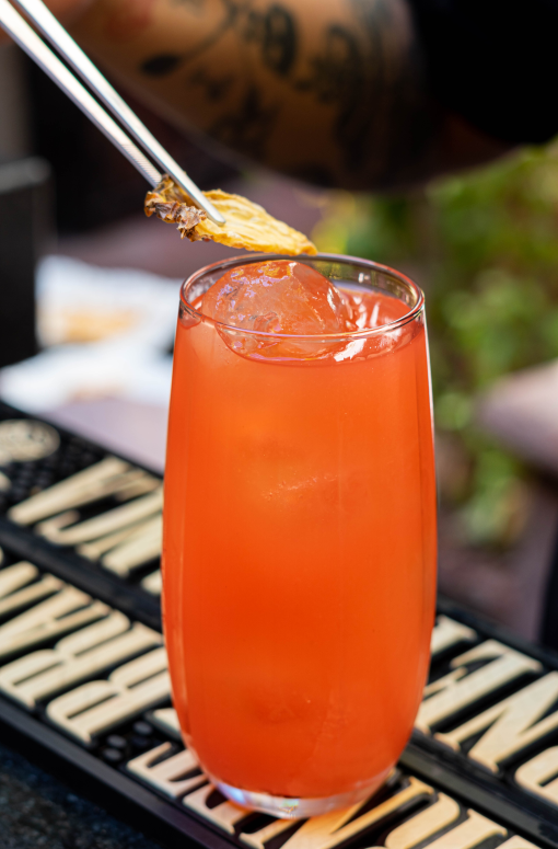 Tequila, chili liquor, orange, lemon, agave syrup, carbon, grasshopper salt.