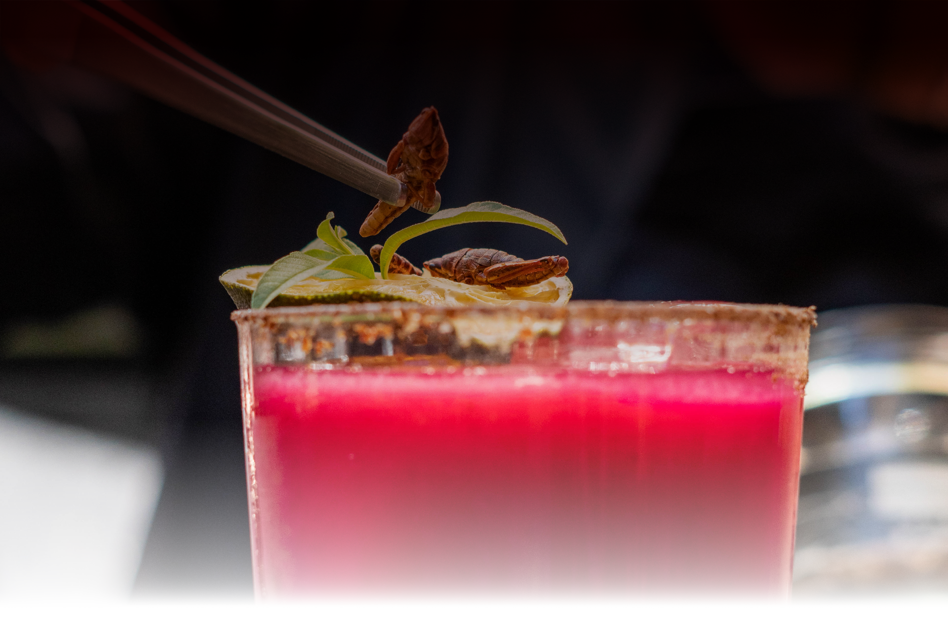 Red prickly, mezcal, grasshopper syrup, eureka lemon and Grand Manier frosted with grasshopper salt.