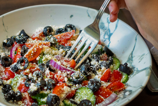 Spinach, 3 kinds of hydroponic lettuce, cucumber, strawberry, apple, orange, starfruit, quesillo, black olives, avocado & almonds.
