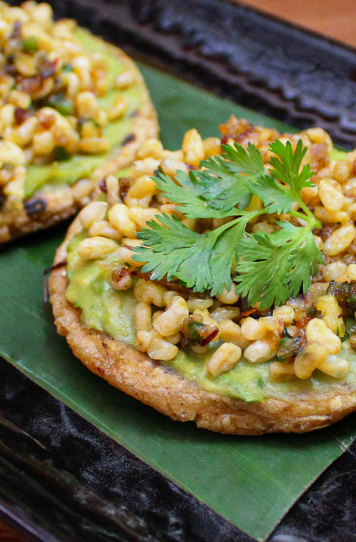 Large corn tortilla, with lard, beans, quesillo & avocado. Optional: add black mole, tasajo, cecina or Oaxacan chorizo.