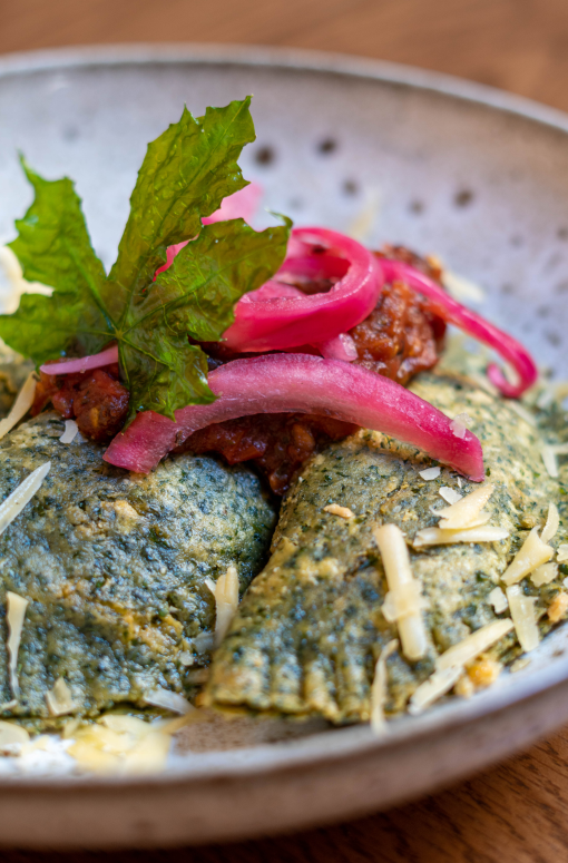Cooked in “hoja santa” and with a sauce made with achilito chilli from Oaxaca, served with roasted zucchini, peppers and green beans with cumin.