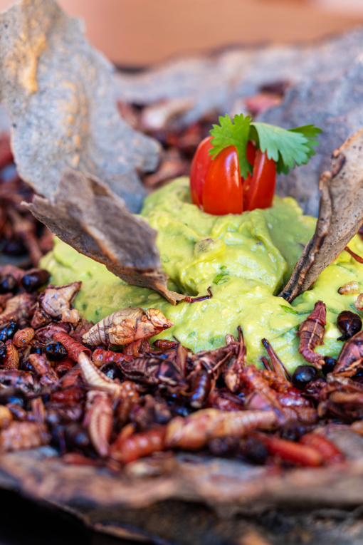 Maguey worms “chinicuil”, “grasshoppers”, “chicatana”ants , served on a tlayuda tortilla made with blue corn tortilla, served with guacamole.