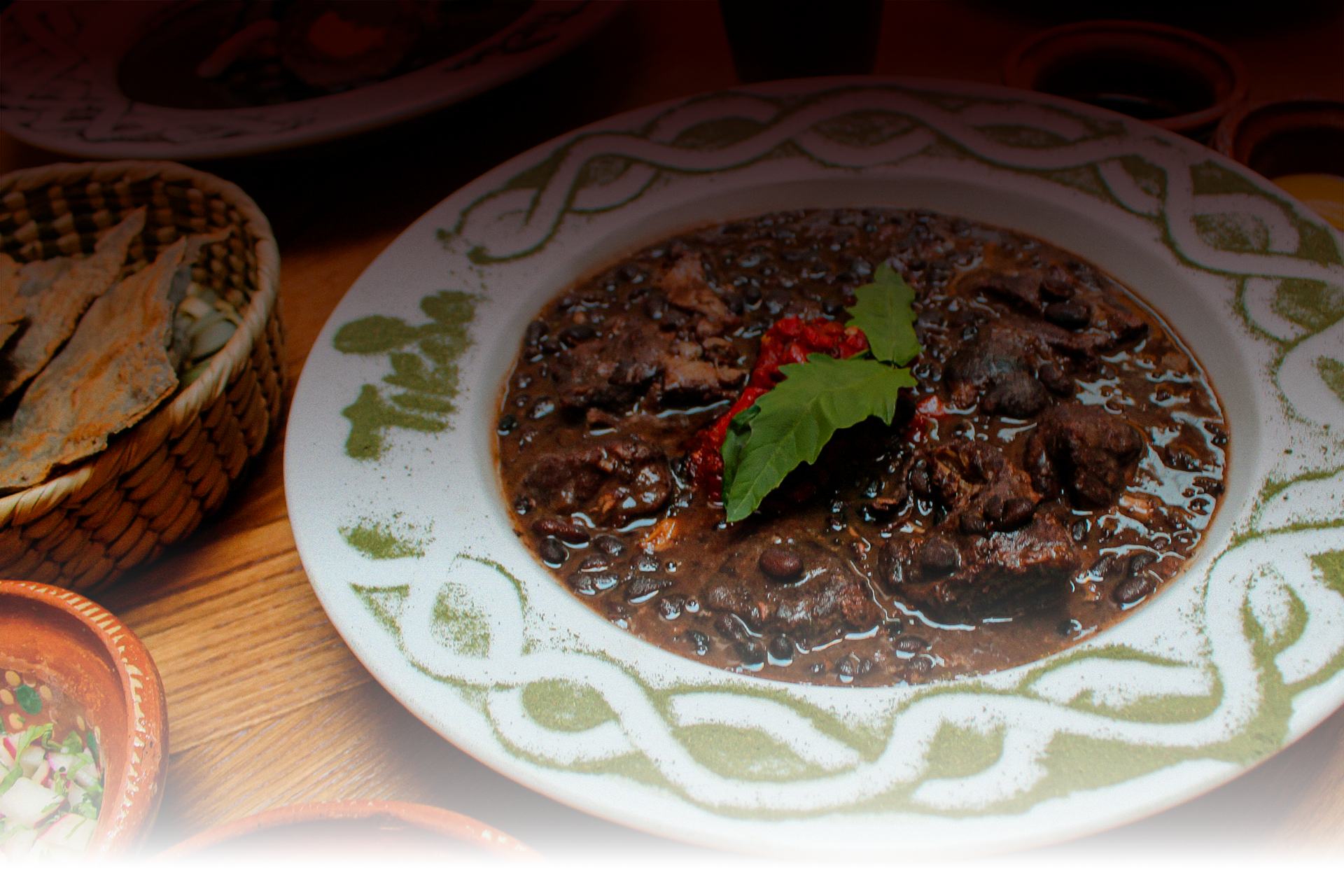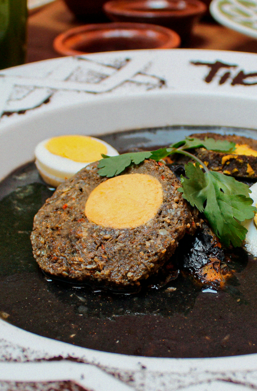 Covered with black chilhuacle chili sauce with jumiles and piloncillo.